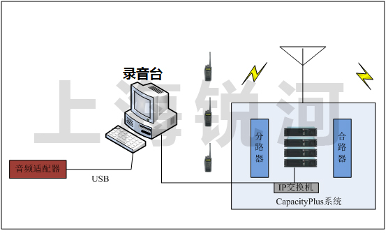 該方式屬于錄音,即通過(guò)網(wǎng)絡(luò)直接獲取數(shù)字中繼臺(tái)的語(yǔ)音數(shù)據(jù)包,解析后存儲(chǔ)到錄音臺(tái)上,相對(duì)于基礎(chǔ)方案這種方式的主要優(yōu)勢(shì)是有利于以后錄音系統(tǒng)的擴(kuò)展以及保證整個(gè)系統(tǒng)不會(huì)被過(guò)多的車載臺(tái)的信號(hào)干擾。整個(gè)錄音系統(tǒng)安裝調(diào)試方便,只需將錄音臺(tái)接入Capacity Plus數(shù)字集群系統(tǒng)即可,并且后續(xù)的維護(hù)也便利。