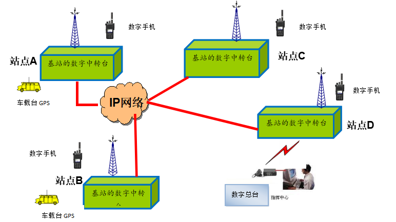 系統(tǒng)將多個(gè)中繼臺(tái)通過(guò)IP網(wǎng)絡(luò)連起來(lái),形成大面積的覆蓋,解決了需要大面積覆蓋的用戶的要求。但經(jīng)過(guò)IP互連的系統(tǒng)的用戶容量相當(dāng)于個(gè)單中繼臺(tái)的系統(tǒng)的用戶容量。